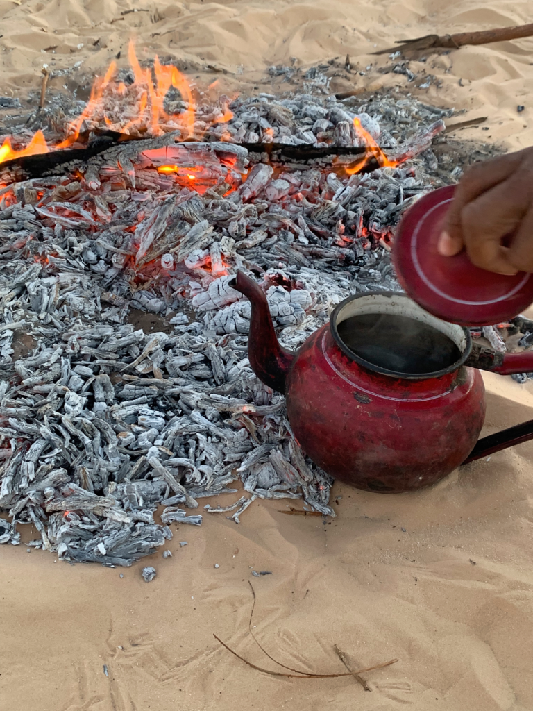Bevor wir uns jedoch auf den Rücken der Kamele schwingen und die ersten Schritte im weichen Sand der Sahara machen, stimmen wir uns mit einer gemeinsamen Teezeremonie auf die kommenden Erlebnisse ein.